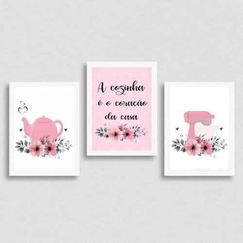 Kit 3 quadros cozinha coração da casa rosa 24x18cm Moldura: madeira branca Informações do produto tire todas as suas dúvidas no descritivo abaixo: decoração para quarto, sala, cozinha, escritório, área gourmet e muito mais. Chega de paredes vazias medidas - cada peça tem 24x18cm a5 . Material do papel - papel fotográfico brilhante de altíssima resolução acabamento - todos os quadros são acompanhados de uma película de acetato para proteção da imagem. - moldura em madeira maciça na cor preta e pendurador móvel que pode ser retirado facilmente caso deseje fixar com fita dupla face. - os quadros são embalados de forma segura com plástico bolha com camada dupla de acordo com o tamanho dos quadros.