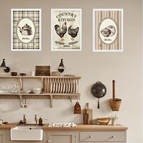 Kit 3 quadros cozinha country kitchen 33x24cm - com vidro Moldura: madeira branca Informações do produto tire todas as suas dúvidas no descritivo abaixo: decoração para quarto, sala, cozinha, escritório, área gourmet e muito mais. Chega de paredes vazias medidas - cada peça tem 33x24cm a4 . Material do papel - papel fotográfico brilhante de altíssima resolução acabamento - todos os quadros são acompanhados de vidro para proteção da imagem. - moldura em madeira maciça na cor preta ou branca conforme produto escolhido e pendurador . - os quadros são embalados de forma segura com plástico bolha com camada dupla de acordo com o tamanho dos quadros. Garantia - garantia de 3 meses. Meu quadro chegou. Como posso fixá-lo Você precisa apenas de um martelo e um prego, pois os quadros já vão acompanhados de penduradores. Esta é a forma mais indicada. Como posso limpar meu quadro A limpeza é feita como um móvel comum da sua casa. Apenas um pano seco ou espanador são suficientes para tal