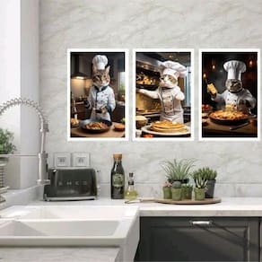 Kit 3 quadros para cozinha gatos cozinhando 33x24cm - com vidro Cor: moldura preta Informações do produto tire todas as suas dúvidas no descritivo abaixo: decoração para quarto, sala, cozinha, escritório, área gourmet e muito mais. Chega de paredes vazias medidas - cada peça tem 33x24cm a4 . Material do papel - papel fotográfico brilhante de altíssima resolução acabamento - todos os quadros são acompanhados de vidro para proteção da imagem. - moldura em madeira maciça na cor preta ou branca conforme produto escolhido e pendurador . - os quadros são embalados de forma segura com plástico bolha com camada dupla de acordo com o tamanho dos quadros. Garantia - garantia de 3 meses. Meu quadro chegou. Como posso fixá-lo Você precisa apenas de um martelo e um prego, pois os quadros já vão acompanhados de penduradores. Esta é a forma mais indicada. Como posso limpar meu quadro A limpeza é feita como um móvel comum da sua casa. Apenas um pano seco ou espanador são suficientes para tal