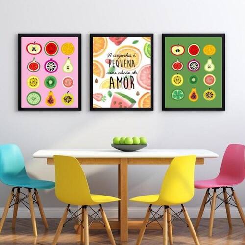 Kit 3 quadros cozinha pequena - frutinhas 45x34cm - com vidro Cor: moldura branca Informações do produto tire todas as suas dúvidas no descritivo abaixo: decoração para quarto, sala, cozinha, escritório, área gourmet e muito mais. Chega de paredes vazias medidas - cada peça tem 45x34cm a3 . Material do papel - papel fotográfico brilhante de altíssima resolução acabamento - todos os quadros são acompanhados de vidro para proteção da imagem. - moldura em madeira maciça na cor preta ou branca conforme produto escolhido e pendurador . - os quadros são embalados de forma segura com plástico bolha com camada dupla de acordo com o tamanho dos quadros. Garantia - garantia de 3 meses. Meu quadro chegou. Como posso fixá-lo Você precisa apenas de um martelo e um prego, pois os quadros já vão acompanhados de penduradores. Esta é a forma mais indicada. Como posso limpar meu quadro A limpeza é feita como um móvel comum da sua casa. Apenas um pano seco ou espanador são suficientes para tal