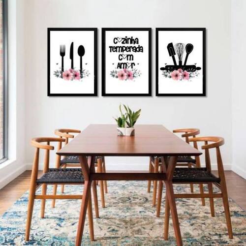 Kit 3 Quadros Cozinha Temperada com Amor 34x23cm - Moldura Branca Tamanho: A4 20 x 30 Acabamento: Película de acetato Moldura: Madeira Branca INFORMAÇÕES DO PRODUTO TIRE TODAS AS SUAS DÚVIDAS NO DESCRITIVO ABAIXO: Decoração para quarto, sala, cozinha, escritório, área gourmet e muito mais. Chega de paredes vazias! MEDIDAS - Cada Peça tem 34x23cm A4 . MATERIAL DO PAPEL - Papel fotográfico brilhante de altíssima resolução ACABAMENTO - Todos os quadros são acompanhados de uma película de acetato para proteção da imagem. - Moldura em madeira maciça na cor branca e pendurador móvel que pode ser retirado facilmente caso deseje fixar com fita dupla face. - Os quadros são embalados de forma segura com plástico bolha com camada dupla de acordo com o tamanho dos quadros. - de 3 meses . MEU QUADRO CHEGOU. COMO POSSO FIXÁ-LO? Você precisa apenas de um martelo e um prego, pois os quadros já vão acompanhados de penduradores. Esta é a forma mais indicada. Caso prefira, você pode utilizar uma fita dupla face neste caso, sugerimos de alta qualidade para evitar que descole e seu quadro caia . COMO POSSO LIMPAR MEU QUADRO? A limpeza é feita como um móvel comum da sua casa. Apenas um pano seco ou espanador são suficientes para tal Marca: Não Informado