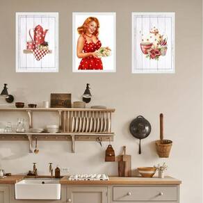 Kit 3 Quadros Cozinha Vermelha Pin Up Poá 45X34Cm - Vidro