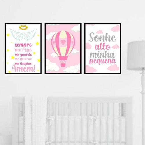 Kit 3 Quadros Decorativos Anjo da Guarda - Sonhe Alto - Tamanho: A4 (20 x 30) / Acabamento: Película de acetato / Moldura: Madeira preta