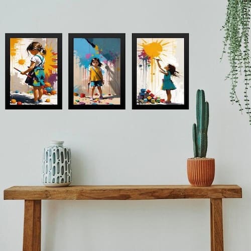 Kit 3 quadros decorativos artes crianças pintando 45x34cm - com vidro Cor: moldura preta Informações do produto tire todas as suas dúvidas no descritivo abaixo: decoração para quarto, sala, cozinha, escritório, área gourmet e muito mais. Chega de paredes vazias medidas - cada peça tem 45x34cm a3 . Material do papel - papel fotográfico brilhante de altíssima resolução acabamento - todos os quadros são acompanhados de vidro para proteção da imagem. - moldura em madeira maciça na cor preta ou branca conforme produto escolhido e pendurador . - os quadros são embalados de forma segura com plástico bolha com camada dupla de acordo com o tamanho dos quadros. Garantia - garantia de 3 meses. Meu quadro chegou. Como posso fixá-lo Você precisa apenas de um martelo e um prego, pois os quadros já vão acompanhados de penduradores. Esta é a forma mais indicada. Como posso limpar meu quadro A limpeza é feita como um móvel comum da sua casa. Apenas um pano seco ou espanador são suficientes para tal