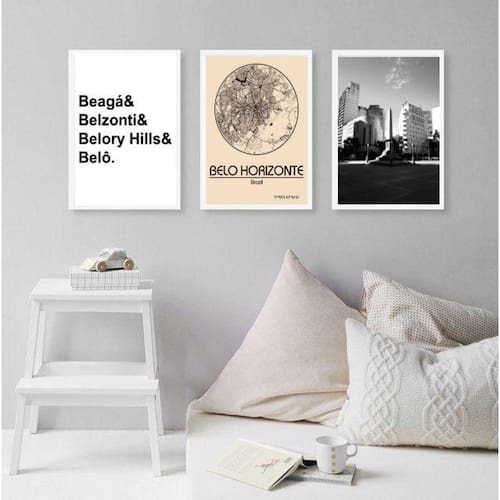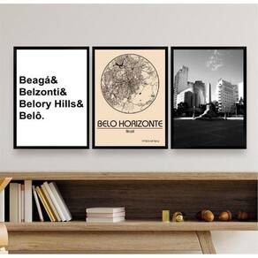 Kit 3 quadros decorativos belo horizonte-mapa cidade 24x18cm - com vidro Moldura: madeira branca Informações do produto tire todas as suas dúvidas no descritivo abaixo: decoração para quarto, sala, cozinha, escritório, área gourmet e muito mais. Chega de paredes vazias medidas - cada peça tem 24x18cm a5 . Material do papel - papel fotográfico brilhante de altíssima resolução acabamento - todos os quadros são acompanhados de vidro para proteção da imagem. - moldura em madeira maciça na cor preta ou branca conforme produto escolhido e pendurador . - os quadros são embalados de forma segura com plástico bolha com camada dupla de acordo com o tamanho dos quadros. Garantia - garantia de 3 meses. Meu quadro chegou. Como posso fixá-lo Você precisa apenas de um martelo e um prego, pois os quadros já vão acompanhados de penduradores. Esta é a forma mais indicada. Como posso limpar meu quadro A limpeza é feita como um móvel comum da sua casa. Apenas um pano seco ou espanador são suficientes para tal Ean: 7899650450074