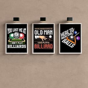 Kit 3 quadros decorativos bilhar sinuca 24x18cm - com vidro Moldura: madeira preta Informações do produto tire todas as suas dúvidas no descritivo abaixo: decoração para quarto, sala, cozinha, escritório, área gourmet e muito mais. Chega de paredes vazias medidas - cada peça tem 24x18cm a5 . Material do papel - papel fotográfico brilhante de altíssima resolução acabamento - todos os quadros são acompanhados de vidro para proteção da imagem. - moldura em madeira maciça na cor preta ou branca conforme produto escolhido e pendurador . - os quadros são embalados de forma segura com plástico bolha com camada dupla de acordo com o tamanho dos quadros. Garantia - garantia de 3 meses. Meu quadro chegou. Como posso fixá-lo Você precisa apenas de um martelo e um prego, pois os quadros já vão acompanhados de penduradores. Esta é a forma mais indicada. Como posso limpar meu quadro A limpeza é feita como um móvel comum da sua casa. Apenas um pano seco ou espanador são suficientes para tal Ean: 7894715376955