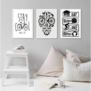 Kit 3 quadros decorativos cantinho da bicicleta 24x18cm - com vidro Moldura: madeira branca Informações do produto tire todas as suas dúvidas no descritivo abaixo: decoração para quarto, sala, cozinha, escritório, área gourmet e muito mais. Chega de paredes vazias medidas - cada peça tem 24x18cm a5 . Material do papel - papel fotográfico brilhante de altíssima resolução acabamento - todos os quadros são acompanhados de vidro para proteção da imagem. - moldura em madeira maciça na cor preta ou branca conforme produto escolhido e pendurador . - os quadros são embalados de forma segura com plástico bolha com camada dupla de acordo com o tamanho dos quadros. Garantia - garantia de 3 meses. Meu quadro chegou. Como posso fixá-lo Você precisa apenas de um martelo e um prego, pois os quadros já vão acompanhados de penduradores. Esta é a forma mais indicada. Como posso limpar meu quadro A limpeza é feita como um móvel comum da sua casa. Apenas um pano seco ou espanador são suficientes para tal