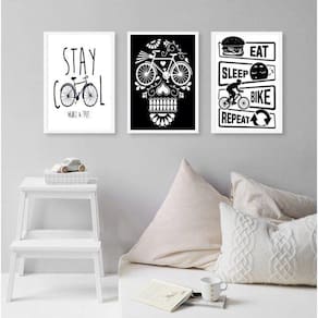 Kit 3 quadros decorativos cantinho da bike 33x24cm - com vidro Moldura: madeira preta Informações do produto tire todas as suas dúvidas no descritivo abaixo: decoração para quarto, sala, cozinha, escritório, área gourmet e muito mais. Chega de paredes vazias medidas - cada peça tem 33x24cm a4 . Material do papel - papel fotográfico brilhante de altíssima resolução acabamento - todos os quadros são acompanhados de vidro para proteção da imagem. - moldura em madeira maciça na cor preta ou branca conforme produto escolhido e pendurador . - os quadros são embalados de forma segura com plástico bolha com camada dupla de acordo com o tamanho dos quadros. Garantia - garantia de 3 meses. Meu quadro chegou. Como posso fixá-lo Você precisa apenas de um martelo e um prego, pois os quadros já vão acompanhados de penduradores. Esta é a forma mais indicada. Como posso limpar meu quadro A limpeza é feita como um móvel comum da sua casa. Apenas um pano seco ou espanador são suficientes para tal Ean: 7893356889992