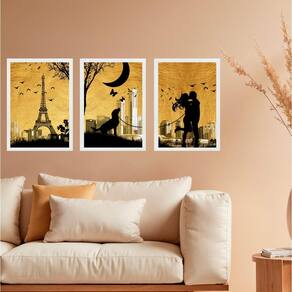 Kit 3 quadros decorativos casal cachorro paris 33x24cm - com vidro Cor: moldura branca Informações do produto tire todas as suas dúvidas no descritivo abaixo: decoração para quarto, sala, cozinha, escritório, área gourmet e muito mais. Chega de paredes vazias medidas - cada peça tem 33x24cm a4 . Material do papel - papel fotográfico brilhante de altíssima resolução acabamento - todos os quadros são acompanhados de vidro para proteção da imagem. - moldura em madeira maciça na cor preta ou branca conforme produto escolhido e pendurador . - os quadros são embalados de forma segura com plástico bolha com camada dupla de acordo com o tamanho dos quadros. - de 3 meses. Meu quadro chegou. Como posso fixá-lo Você precisa apenas de um martelo e um prego, pois os quadros já vão acompanhados de penduradores. Esta é a forma mais indicada. Como posso limpar meu quadro A limpeza é feita como um móvel comum da sua casa. Apenas um pano seco ou espanador são suficientes para tal