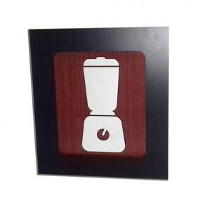 Com desenho criativo de panela, liquidificador e jogo de colheres cortado a laser em relevo no mdf branco