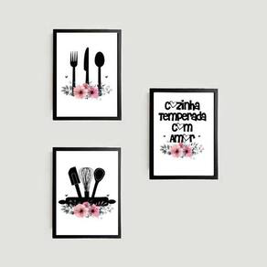 Kit 3 Quadros Decorativos Cozinha Temperada com Amor - Tamanho: A4 (20 x 30) / Acabamento: Película de acetato / Moldura: Madeira preta