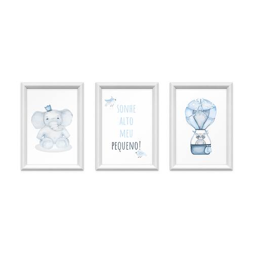 Kit 3 Quadros Decorativos Elefante Balão Azul 24x34cm