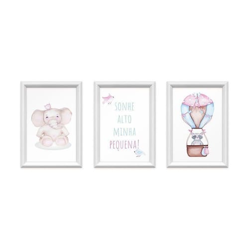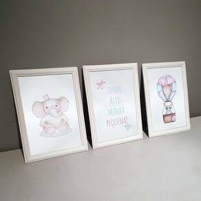 Kit 3 Quadros Decorativos Elefante Balão Rosa 24x34cm