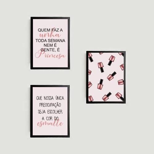 Kit 3 quadros decorativos esmalteria 45x34cm - com vidro Moldura: madeira preta Informações do produto tire todas as suas dúvidas no descritivo abaixo: decoração para quarto, sala, cozinha, escritório, área gourmet e muito mais. Chega de paredes vazias medidas - cada peça tem 45x34cm a3 . Material do papel - papel fotográfico brilhante de altíssima resolução acabamento - todos os quadros são acompanhados de vidro para proteção da imagem. - moldura em madeira maciça na cor preta e pendurador . - os quadros são embalados de forma segura com plástico bolha com camada dupla de acordo com o tamanho dos quadros. - de 3 meses. Meu quadro chegou. Como posso fixá-lo Você precisa apenas de um martelo e um prego, pois os quadros já vão acompanhados de penduradores. Esta é a forma mais indicada. Como posso limpar meu quadro A limpeza é feita como um móvel comum da sua casa. Apenas um pano seco ou espanador são suficientes para tal Marca: Não Informado