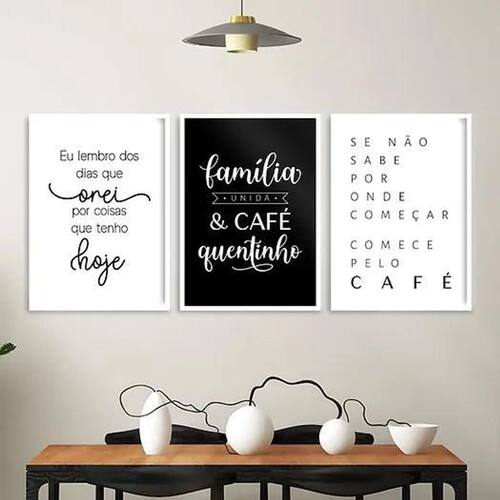 Kit 3 quadros decorativos família e café 45x34cm Cor: moldura preta Informações do produto tire todas as suas dúvidas no descritivo abaixo: decoração para quarto, sala, cozinha, escritório, área gourmet e muito mais. Chega de paredes vazias. Medidas - cada peça tem 45x34cm a3 . Material do papel - papel fotográfico brilhante de altíssima resolução acabamento - todos os quadros são acompanhados de uma película de acetato para proteção da imagem. - os quadros são embalados de forma segura com plástico bolha com camada dupla de acordo com o tamanho dos quadros. Garantia - garantia de 3 meses. Meu quadro chegou. Como posso fixá-lo Você precisa apenas de um martelo e um prego, pois os quadros já vão acompanhados de penduradores. Esta é a forma mais indicada. Caso prefira, você pode utilizar uma fita dupla face neste caso, sugerimos de alta qualidade para evitar que descole e seu quadro caia . Como posso limpar meu quadro A limpeza é feita como um móvel comum da sua casa. Apenas um pano seco ou espanador são suficientes para tal