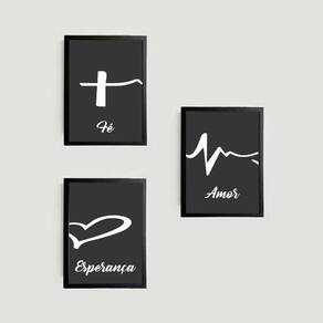 Kit 3 Quadros Decorativos Fé, Amor, Esperança - Tamanho: A4 (20 x 30) / Acabamento: Película de acetato / Moldura: Madeira preta