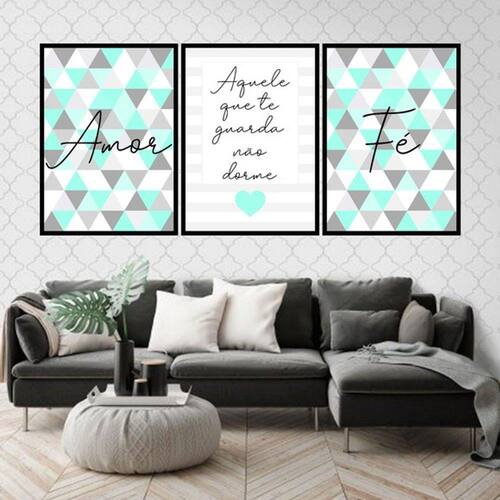 Kit 3 Quadros Decorativos Fé Amor Triângulos Turquesa - Tamanho: A4 (20 x 30) / Acabamento: Película de acetato / Moldura: Madeira preta