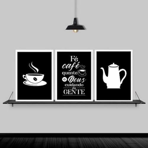 Kit 3 quadros decorativos fé café e deus 24x18cm - com vidro Moldura: madeira branca Informações do produto Decoração para quarto, sala, cozinha, escritório, área gourmet e muito mais. Chega de paredes vazias Medidas - cada peça tem 24x18cm a5 . Material do papel - papel fotográfico brilhante de altíssima resolução Acabamento - todos os quadros são acompanhados de vidro para proteção da imagem. - Moldura em madeira maciça e pendurador . - Os quadros são embalados de forma segura com plástico bolha com camada dupla de acordo com o tamanho dos quadros. - de 3 meses. Meu quadro chegou. Como posso fixá-lo Você precisa apenas de um martelo e um prego, pois os quadros já vão acompanhados de penduradores. Esta é a forma mais indicada. Como posso limpar meu quadro A limpeza é feita como um móvel comum da sua casa. Apenas um pano seco ou espanador são suficientes para tal