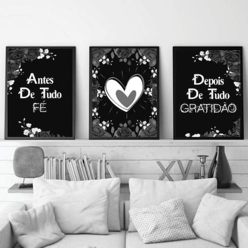 Kit 3 Quadros Decorativos Fé e Gratidão Preto com Cinza - Tamanho: A4 (20 x 30) / Acabamento: Película de acetato / Moldura: Madeira preta
