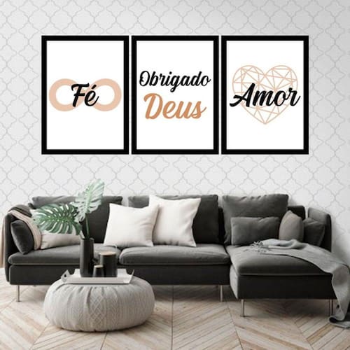 Kit 3 Quadros Decorativos Fé, Obrigado Deus - Marrom - Tamanho: A4 (20 x 30) / Acabamento: Película de acetato / Moldura: Madeira preta