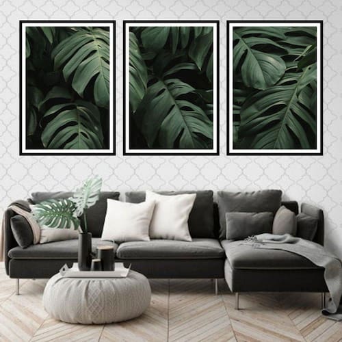 Kit 3 Quadros Decorativos Folhas Tropicais - Tamanho: A4 (20 x 30) / Acabamento: Película de acetato / Moldura: Madeira preta