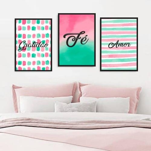 Kit 3 Quadros Decorativos Gratidão, Amor, Fé Rosa/Verde - Tamanho: A4 (20 x 30) / Acabamento: Película de acetato / Moldura: Madeira preta