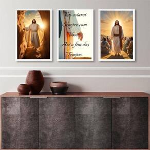 Kit 3 quadros decorativos jesus- eu estarei sempre com vocês 33x24cm - com vidro Moldura: madeira branca Informações do produto tire todas as suas dúvidas no descritivo abaixo: decoração para quarto, sala, cozinha, escritório, área gourmet e muito mais. Chega de paredes vazias medidas - cada peça tem 33x24cm a4 . Material do papel - papel fotográfico brilhante de altíssima resolução acabamento - todos os quadros são acompanhados de vidro para proteção da imagem. - moldura em madeira maciça na cor preta ou branca conforme produto escolhido e pendurador . - os quadros são embalados de forma segura com plástico bolha com camada dupla de acordo com o tamanho dos quadros. Garantia - garantia de 3 meses. Meu quadro chegou. Como posso fixá-lo Você precisa apenas de um martelo e um prego, pois os quadros já vão acompanhados de penduradores. Esta é a forma mais indicada. Como posso limpar meu quadro A limpeza é feita como um móvel comum da sua casa. Apenas um pano seco ou espanador são suficientes para tal Ean: 7890559438224