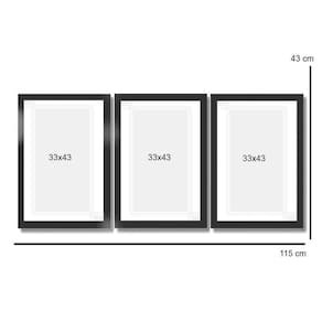 Com dimensões montadas de 43x105 cm, esse kit conta com 3 quadros, cada um medindo 33x43 cm. A moldura laqueada lisa de 2cm de espessura é feita de madeira maciça de reflorestamento, com acabamento fosco e livre de imperfeições. Além disso, as molduras possuem pendurador para facilitar a instalação.
