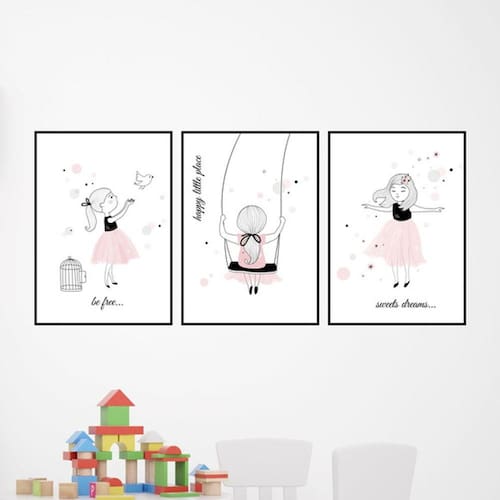 Kit 3 Quadros Decorativos Menina, Balanço e Pássaro - Tamanho: A4 (20 x 30) / Acabamento: Película de acetato / Moldura: Madeira preta