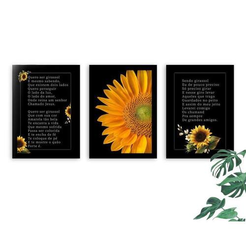 Kit 3 Quadros Decorativos Molduras Pretas Poema Girassol Quadros decorativos fabricados com moldura de madeira de reflorestamento com acabamento laqueado, impressão a laser em papel couché 300g, fundo em madeira. As paredes ganham cor e vida com quadros e painéis decorativos. Escolha os modelos que faltam para deixar sua decoração ainda mais bonita. Na sala, no quarto ou em outros cômodos, as peças coloridas ou em preto e branco garantem mais estilo.