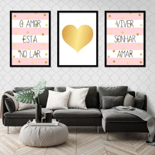 Kit 3 Quadros Decorativos O Amor Está No Ar - Tamanho: A4 (20 x 30) / Acabamento: Película de acetato / Moldura: Madeira preta