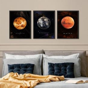 Kit 3 quadros decorativos planetas 24x18cm Moldura: madeira preta Informações do produto tire todas as suas dúvidas no descritivo abaixo: decoração para quarto, sala, cozinha, escritório, área gourmet e muito mais. Chega de paredes vazias medidas - cada peça tem 24x18cm a5 . Material do papel - papel fotográfico brilhante de altíssima resolução acabamento - todos os quadros são acompanhados de uma película de acetato para proteção da imagem. - os quadros são embalados de forma segura com plástico bolha com camada dupla de acordo com o tamanho dos quadros. Garantia - garantia de 3 meses. Meu quadro chegou. Como posso fixá-lo Você precisa apenas de um martelo e um prego, pois os quadros já vão acompanhados de penduradores. Esta é a forma mais indicada. Caso prefira, você pode utilizar uma fita dupla face neste caso, sugerimos de alta qualidade para evitar que descole e seu quadro caia . Como posso limpar meu quadro A limpeza é feita como um móvel comum da sua casa. Apenas um pano seco ou espanador são suficientes para tal