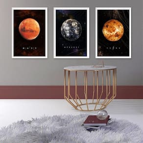 Kit 3 quadros decorativos planetas 33x24cm Moldura: madeira branca Informações do produto tire todas as suas dúvidas no descritivo abaixo: decoração para quarto, sala, cozinha, escritório, área gourmet e muito mais. Chega de paredes vazias medidas - cada peça tem 33x24cm a4 . Material do papel - papel fotográfico brilhante de altíssima resolução acabamento - todos os quadros são acompanhados de uma película de acetato para proteção da imagem. - os quadros são embalados de forma segura com plástico bolha com camada dupla de acordo com o tamanho dos quadros. Garantia - garantia de 3 meses. Meu quadro chegou. Como posso fixá-lo Você precisa apenas de um martelo e um prego, pois os quadros já vão acompanhados de penduradores. Esta é a forma mais indicada. Caso prefira, você pode utilizar uma fita dupla face neste caso, sugerimos de alta qualidade para evitar que descole e seu quadro caia . Como posso limpar meu quadro A limpeza é feita como um móvel comum da sua casa. Apenas um pano seco ou espanador são suficientes para tal