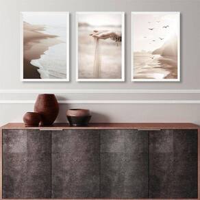 Kit 3 quadros decorativos praia bege e marrom 33x24cm