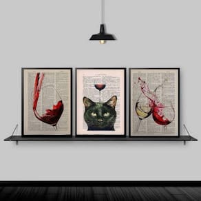 Kit 3 quadros decorativos vinhos e gato 24x18cm - com vidro Moldura: madeira preta Informações do produto tire todas as suas dúvidas no descritivo abaixo: decoração para quarto, sala, cozinha, escritório, área gourmet e muito mais. Chega de paredes vazias medidas - cada peça tem 24x18cm a5 . Material do papel - papel fotográfico brilhante de altíssima resolução acabamento - todos os quadros são acompanhados de vidro para proteção da imagem. - moldura em madeira maciça na cor preta e pendurador . - os quadros são embalados de forma segura com plástico bolha com camada dupla de acordo com o tamanho dos quadros. Garantia - garantia de 3 meses. Meu quadro chegou. Como posso fixá-lo Você precisa apenas de um martelo e um prego, pois os quadros já vão acompanhados de penduradores. Esta é a forma mais indicada. Como posso limpar meu quadro A limpeza é feita como um móvel comum da sua casa. Apenas um pano seco ou espanador são suficientes para tal