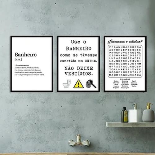 Kit 3 quadros divertidos para banheiro 24x18cm - com vidro Moldura: madeira preta Informações do produto tire todas as suas dúvidas no descritivo abaixo: decoração para quarto, sala, cozinha, escritório, área gourmet e muito mais. Chega de paredes vazias medidas - cada peça tem 24x18cm a5 . Material do papel - papel fotográfico brilhante de altíssima resolução acabamento - todos os quadros são acompanhados de vidro para proteção da imagem. - moldura em madeira maciça na cor preta e pendurador . - os quadros são embalados de forma segura com plástico bolha com camada dupla de acordo com o tamanho dos quadros. - de 3 meses. Meu quadro chegou. Como posso fixá-lo Você precisa apenas de um martelo e um prego, pois os quadros já vão acompanhados de penduradores. Esta é a forma mais indicada. Como posso limpar meu quadro A limpeza é feita como um móvel comum da sua casa. Apenas um pano seco ou espanador são suficientes para tal Marca: Não Informado