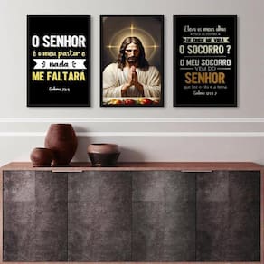 Kit 3 quadros evangélicos para cozinha- o senhor é meu pastor 45x34cm - com vidro Moldura: madeira branca Informações do produto tire todas as suas dúvidas no descritivo abaixo: decoração para quarto, sala, cozinha, escritório, área gourmet e muito mais. Chega de paredes vazias medidas - cada peça tem 45x34cm a3 . Material do papel - papel fotográfico brilhante de altíssima resolução acabamento - todos os quadros são acompanhados de vidro para proteção da imagem. - moldura em madeira maciça na cor preta ou branca conforme produto escolhido e pendurador . - os quadros são embalados de forma segura com plástico bolha com camada dupla de acordo com o tamanho dos quadros. Garantia - garantia de 3 meses. Meu quadro chegou. Como posso fixá-lo Você precisa apenas de um martelo e um prego, pois os quadros já vão acompanhados de penduradores. Esta é a forma mais indicada. Como posso limpar meu quadro A limpeza é feita como um móvel comum da sua casa. Apenas um pano seco ou espanador são suficientes para tal Ean: 7892431596060