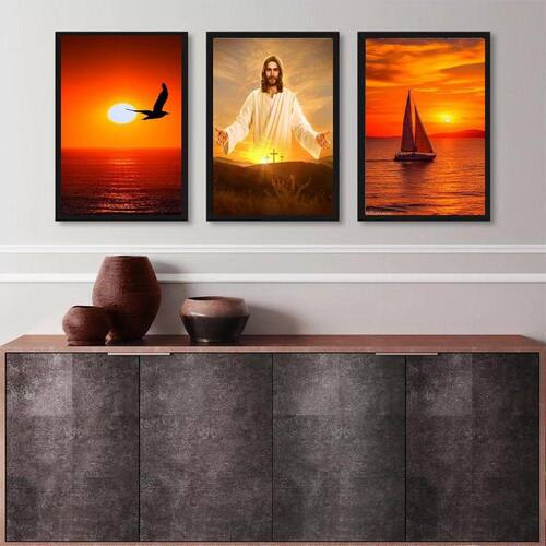 Kit 3 Quadros Evangélicos Jesus Por Do Sol 33X24Cm - Vidro