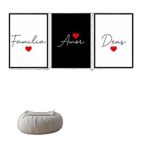 Kit 3 quadros família, amor e deus 45x34cm - com vidro Moldura: madeira preta Informações do produto tire todas as suas dúvidas no descritivo abaixo: decoração para quarto, sala, cozinha, escritório, área gourmet e muito mais. Chega de paredes vazias medidas - cada peça tem 45x34cm a3 . Material do papel - papel fotográfico brilhante de altíssima resolução acabamento - todos os quadros são acompanhados de vidro para proteção da imagem. - moldura em madeira maciça na cor preta e pendurador . - os quadros são embalados de forma segura com plástico bolha com camada dupla de acordo com o tamanho dos quadros. - de 3 meses. Meu quadro chegou. Como posso fixá-lo Você precisa apenas de um martelo e um prego, pois os quadros já vão acompanhados de penduradores. Esta é a forma mais indicada. Como posso limpar meu quadro A limpeza é feita como um móvel comum da sua casa. Apenas um pano seco ou espanador são suficientes para tal Marca: Não Informado