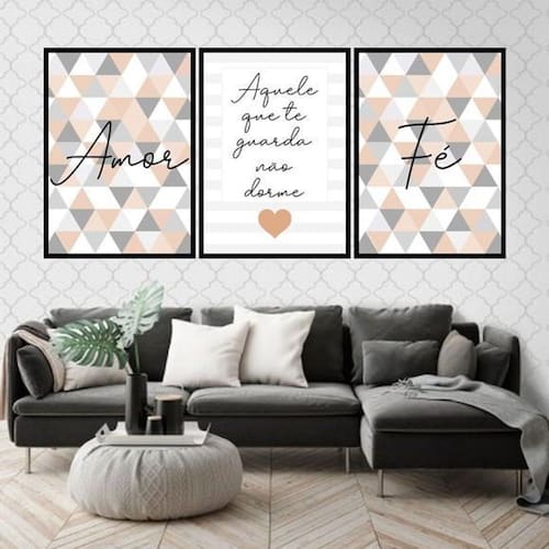 Kit 3 quadros fé amor triângulos marrom 33x24cm - com vidro Moldura: madeira preta Informações do produto tire todas as suas dúvidas no descritivo abaixo: decoração para quarto, sala, cozinha, escritório, área gourmet e muito mais. Chega de paredes vazias medidas - cada peça tem 33x24cm a4 . Material do papel - papel fotográfico brilhante de altíssima resolução acabamento - todos os quadros são acompanhados de vidro para proteção da imagem. - moldura em madeira maciça na cor preta e pendurador . - os quadros são embalados de forma segura com plástico bolha com camada dupla de acordo com o tamanho dos quadros. - de 3 meses. Meu quadro chegou. Como posso fixá-lo Você precisa apenas de um martelo e um prego, pois os quadros já vão acompanhados de penduradores. Esta é a forma mais indicada. Como posso limpar meu quadro A limpeza é feita como um móvel comum da sua casa. Apenas um pano seco ou espanador são suficientes para tal