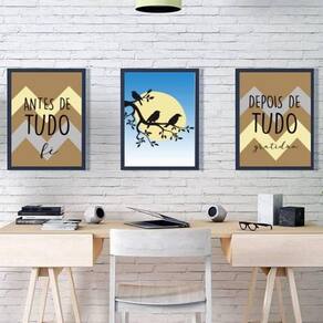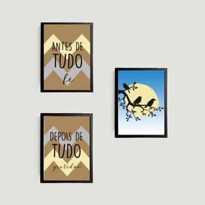 Kit 3 quadros fé e gratidão pássaros 45x34cm - com vidro Moldura: madeira preta Informações do produto tire todas as suas dúvidas no descritivo abaixo: decoração para quarto, sala, cozinha, escritório, área gourmet e muito mais. Chega de paredes vazias medidas - cada peça tem 45x34cm a3 . Material do papel - papel fotográfico brilhante de altíssima resolução acabamento - todos os quadros são acompanhados de vidro para proteção da imagem. - moldura em madeira maciça na cor preta e pendurador . - os quadros são embalados de forma segura com plástico bolha com camada dupla de acordo com o tamanho dos quadros. - de 3 meses. Meu quadro chegou. Como posso fixá-lo Você precisa apenas de um martelo e um prego, pois os quadros já vão acompanhados de penduradores. Esta é a forma mais indicada. Como posso limpar meu quadro A limpeza é feita como um móvel comum da sua casa. Apenas um pano seco ou espanador são suficientes para tal Marca: Não Informado