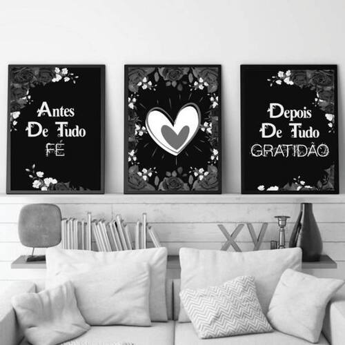 Kit 3 quadros fé e gratidão preto com cinza 45x34cm - com vidro Moldura: madeira preta Informações do produto tire todas as suas dúvidas no descritivo abaixo: decoração para quarto, sala, cozinha, escritório, área gourmet e muito mais. Chega de paredes vazias medidas - cada peça tem 45x34cm a3 . Material do papel - papel fotográfico brilhante de altíssima resolução acabamento - todos os quadros são acompanhados de vidro para proteção da imagem. - moldura em madeira maciça na cor preta e pendurador . - os quadros são embalados de forma segura com plástico bolha com camada dupla de acordo com o tamanho dos quadros. - de 3 meses. Meu quadro chegou. Como posso fixá-lo Você precisa apenas de um martelo e um prego, pois os quadros já vão acompanhados de penduradores. Esta é a forma mais indicada. Como posso limpar meu quadro A limpeza é feita como um móvel comum da sua casa. Apenas um pano seco ou espanador são suficientes para tal