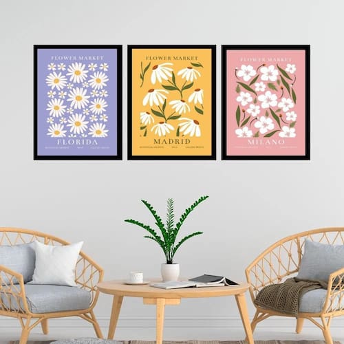 Kit 3 quadros flores flowers market 45x34cm - com vidro Cor: moldura branca Informações do produto tire todas as suas dúvidas no descritivo abaixo: decoração para quarto, sala, cozinha, escritório, área gourmet e muito mais. Chega de paredes vazias medidas - cada peça tem 45x34cm a3 . Material do papel - papel fotográfico brilhante de altíssima resolução acabamento - todos os quadros são acompanhados de vidro para proteção da imagem. - moldura em madeira maciça na cor preta ou branca conforme produto escolhido e pendurador . - os quadros são embalados de forma segura com plástico bolha com camada dupla de acordo com o tamanho dos quadros. Garantia - garantia de 3 meses. Meu quadro chegou. Como posso fixá-lo Você precisa apenas de um martelo e um prego, pois os quadros já vão acompanhados de penduradores. Esta é a forma mais indicada. Como posso limpar meu quadro A limpeza é feita como um móvel comum da sua casa. Apenas um pano seco ou espanador são suficientes para tal