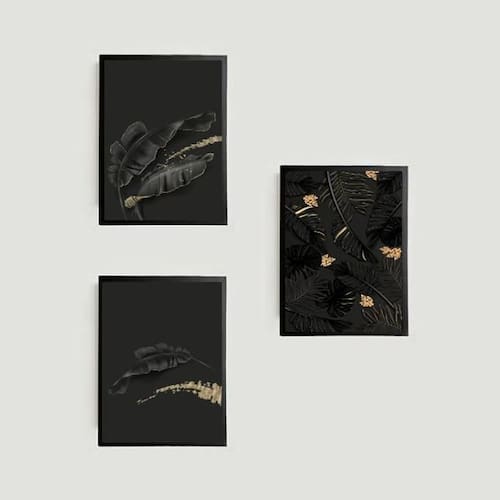 Kit 3 Quadros Folhas Pretas 24X18Cm - Decoração para Ambientes O Kit 3 Quadros Folhas Pretas 24X18Cm é perfeito para dar vida e personalidade aos seus ambientes. Seja no quarto, sala, cozinha, escritório ou área gourmet, não deixe as paredes vazias. Cada peça do kit possui as medidas de 24x18cm, equivalente ao tamanho A5, ideal para compor sua decoração de forma equilibrada. Os quadros são feitos com papel fotográfico brilhante de altíssima resolução, proporcionando imagens nítidas e de qualidade excepcional. A moldura em madeira maciça na cor branca confere um toque de elegância e sofisticação aos quadros. Além disso, eles vêm acompanhados de uma película de acetato para proteção da imagem. Para facilitar a fixação dos quadros, eles possuem penduradores móveis que podem ser retirados facilmente caso prefira utilizar fita dupla face. Recomendamos o uso de fita dupla face de alta qualidade para evitar que os quadros descolem e caiam. A embalagem dos quadros é feita com plástico bolha de camada dupla, garantindo a segurança durante o transporte. Com de 3 meses, você pode ter a tranquilidade de adquirir um produto de qualidade. Além disso, a limpeza dos quadros é muito simples. Basta utilizar um pano seco ou espanador, como você faria com qualquer outro móvel da sua casa. Adquira agora o Kit 3 Quadros Folhas Pretas 24X18Cm e transforme seus ambientes com muito estilo e bom gosto.