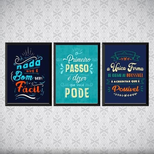 Kit 3 quadros frases motivacionais corporativas 24x18cm - com vidro Moldura: madeira preta Informações do produto Decoração para quarto, sala, cozinha, escritório, área gourmet e muito mais. Chega de paredes vazias medidas - cada peça tem 24x18cm a5 . Material do papel - papel fotográfico brilhante de altíssima resolução Acabamento - todos os quadros são acompanhados de vidro para proteção da imagem. - moldura em madeira maciça e pendurador. - os quadros são embalados de forma segura com plástico bolha com camada dupla de acordo com o tamanho dos quadros. - de 3 meses. Meu quadro chegou. Como posso fixá-lo Você precisa apenas de um martelo e um prego, pois os quadros já vão acompanhados de penduradores. Esta é a forma mais indicada. Como posso limpar meu quadro A limpeza é feita como um móvel comum da sua casa. Apenas um pano seco ou espanador são suficientes para tal