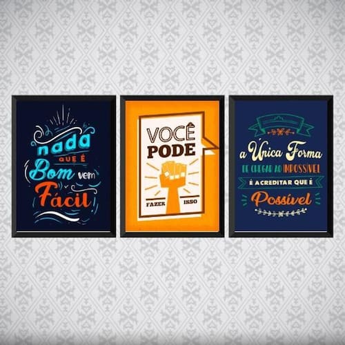 Kit 3 quadros frases motivadoras trabalho 33x24cm - com vidro Moldura: madeira preta Informações do produto Decoração para quarto, sala, cozinha, escritório, área gourmet e muito mais. Chega de paredes vazias medidas - cada peça tem 33x24cm a4 . Material do papel - papel fotográfico brilhante de altíssima resolução Acabamento - todos os quadros são acompanhados de vidro para proteção da imagem. - moldura em madeira maciça e pendurador. - os quadros são embalados de forma segura com plástico bolha com camada dupla de acordo com o tamanho dos quadros. - de 3 meses. Meu quadro chegou. Como posso fixá-lo Você precisa apenas de um martelo e um prego, pois os quadros já vão acompanhados de penduradores. Esta é a forma mais indicada. Como posso limpar meu quadro A limpeza é feita como um móvel comum da sua casa. Apenas um pano seco ou espanador são suficientes para tal Marca: Não Informado