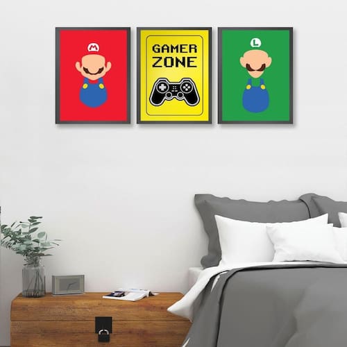 O Kit 3 Quadros Para Quarto Gamer Zone Coloridos 33X24Cm é perfeito para os amantes de jogos que desejam decorar seu ambiente com estilo e personalidade. Com uma moldura de madeira preta, os quadros são ideais para serem utilizados em quartos, salas, cozinhas, escritórios, áreas gourmet e muito mais. Chega de paredes vazias! Cada peça do kit possui as medidas de 33x24cm tamanho A4 , proporcionando um ótimo destaque na decoração. O material do papel utilizado é o papel fotográfico brilhante de altíssima resolução, garantindo imagens nítidas e de qualidade. Além disso, os quadros são acompanhados de uma película de acetato para proteção da imagem. Para garantir a segurança no transporte, os quadros são embalados de forma segura com plástico bolha de camada dupla, de acordo com o tamanho de cada peça. Assim, você recebe os quadros em perfeito estado, prontos para decorar o seu ambiente. E para facilitar a fixação dos quadros, eles já vão acompanhados de penduradores. Tudo o que você precisa é de um martelo e um prego. Caso prefira, também é possível utilizar uma fita dupla face de alta qualidade para fixá-los na parede. A limpeza dos quadros é muito simples, basta utilizar um pano seco ou um espanador, como você faria com qualquer móvel da sua casa. Dessa forma, você consegue manter seus quadros sempre limpos e em perfeito estado. de 3 meses para o seu kit de quadros, para que você possa comprar com tranquilidade e segurança. Decore o seu quarto com o Kit 3 Quadros Para Quarto Gamer Zone Coloridos 33X24Cm e mostre a todos o seu amor pelos jogos Marca: Não Informado