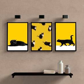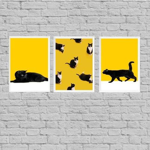 Kit 3 quadros gato preto e amarelo 45x34cm - com vidro Moldura: madeira preta Informações do produto tire todas as suas dúvidas no descritivo abaixo: decoração para quarto, sala, cozinha, escritório, área gourmet e muito mais. Chega de paredes vazias medidas - cada peça tem 45x34cm a3 . Material do papel - papel fotográfico brilhante de altíssima resolução acabamento - todos os quadros são acompanhados de vidro para proteção da imagem. - moldura em madeira maciça na cor preta e pendurador . - os quadros são embalados de forma segura com plástico bolha com camada dupla de acordo com o tamanho dos quadros. - de 3 meses. Meu quadro chegou. Como posso fixá-lo Você precisa apenas de um martelo e um prego, pois os quadros já vão acompanhados de penduradores. Esta é a forma mais indicada. Como posso limpar meu quadro A limpeza é feita como um móvel comum da sua casa. Apenas um pano seco ou espanador são suficientes para tal