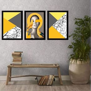 Kit 3 Quadros Geométricos Mulher Cinza E Amarelo 33X24Cm