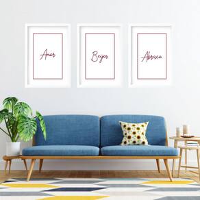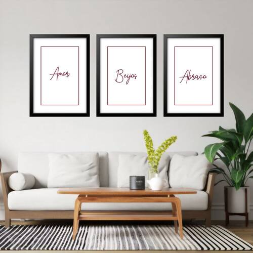 Kit 3 Quadros Grandes Amor Beijos e Abraço 60x48cm - Cor: Moldura Preta